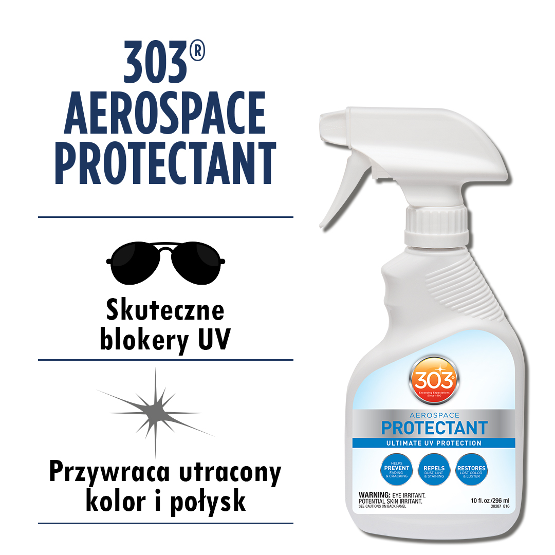 303 Aerospace Protectant został pierwotnie zaprojektowany w celu ochrony elementów z tworzyw sztucznych będących wyposażeniem samolotów oraz promów kosmicznych. Jest jednym z najbardziej technologicznie zaawansowanych produktów dostarczających ochrony przed promieniowaniem UV. Aerospace protectant jest produktem posiadającym filtr SPF 40 przeznaczonym do zabezpieczenia wszelkiego rodzaju powierzchni syntetycznych takich jak guma (opony, uszczelki), winyl, tapicerka skórzana, plastik, włókno węglowe. Regularne użycie daje 100% ochrony przed negatywnym wpływem promieni UV.