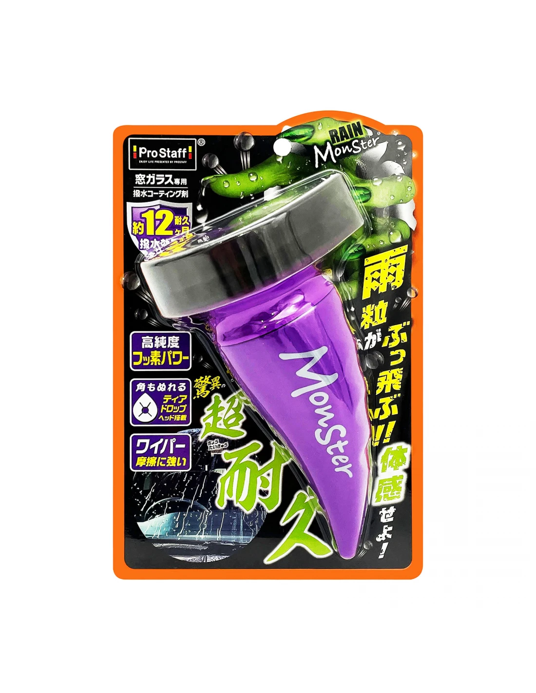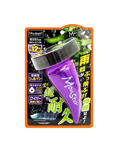 Rain Monster Strong to niewidzialna wycieraczka do nakładania na szyby w celu poprawy widoczności w deszczowe dni. Aplikacja odbywa się w prosty i szybki sposób, bez bezpośredniego kontaktu z dłońmi. Właściwości hydrofobowe utrzymują się do 12 miesiący, a zawdzięczamy je hybrydowej formule łączącej związki silikonu i fluoru. Krople deszczu nie przylegają do szyb, co zapewnia bezpieczną widoczność nawet w przypadku nagłej ulewy, tajfunu, a także zabrudzenia wodą z kałuży. Szczególny nacisk kładziemy również na filcową końcówkę, a jej kształt (przypominający kroplę) pozwala na aplikację preparatu za jednym razem na dużej powierzchni. Trójkątną część używamy do nakładania preparatu w trudno dostępnych miejscach, co przyspiesza cały proces.