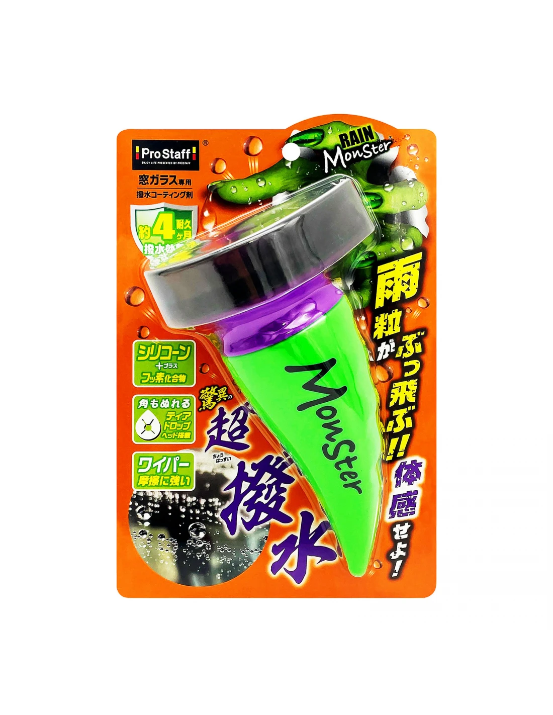 Rain Monster Splash to niewidzialna wycieraczka do nakładania na szyby w celu poprawy widoczności w deszczowe dni. Aplikacja odbywa się w prosty i szybki sposób, bez bezpośredniego kontaktu z dłońmi. Właściwości hydrofobowe utrzymują do 4 miesięcy, a zawdzięczamy je hybrydowej formule łączącej związki silikonu i fluoru. Krople deszczu nie przylegają do szyb, co zapewnia bezpieczną widoczność nawet w przypadku nagłej ulewy, tajfunu, a także zabrudzenia wodą z kałuży. Szczególny nacisk kładziemy również na filcową końcówkę, a jej kształt (przypominający kroplę) pozwala na aplikację preparatu za jednym razem na dużej powierzchni. Trójkątną część używamy do nakładania preparatu w trudno dostępnych miejscach, co przyspiesza cały proces.