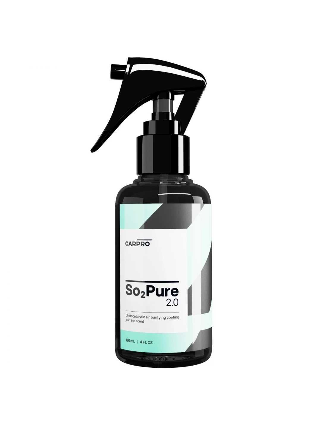 CarPro So2Pure 2.0 – to ewolucja fotokatalitycznej powłoki do usuwania nieprzyjemnych zapachów z wnętrza samochodu, która bazuje na najnowszej technologii TiO2. Aktywuje się pod wpływem światła i skutecznie eliminuje nawet najsilniejsze zapachy i zanieczyszczenia. Pozostawia przyjemny zapach jaśminu.
