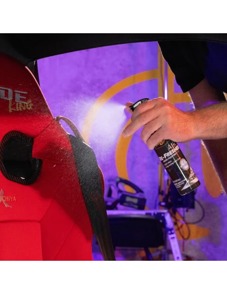 Nie rozpylać bezpośrednio na podsufitkę ani nie moczyć tapicerki. Nie stosować na twardych powierzchniach. W przypadku nadmiaru produktu na plastiku, winylu lub skórze – zetrzeć mikrofibrą przed wyschnięciem. W przypadku silnych odorów może być konieczna druga aplikacja.